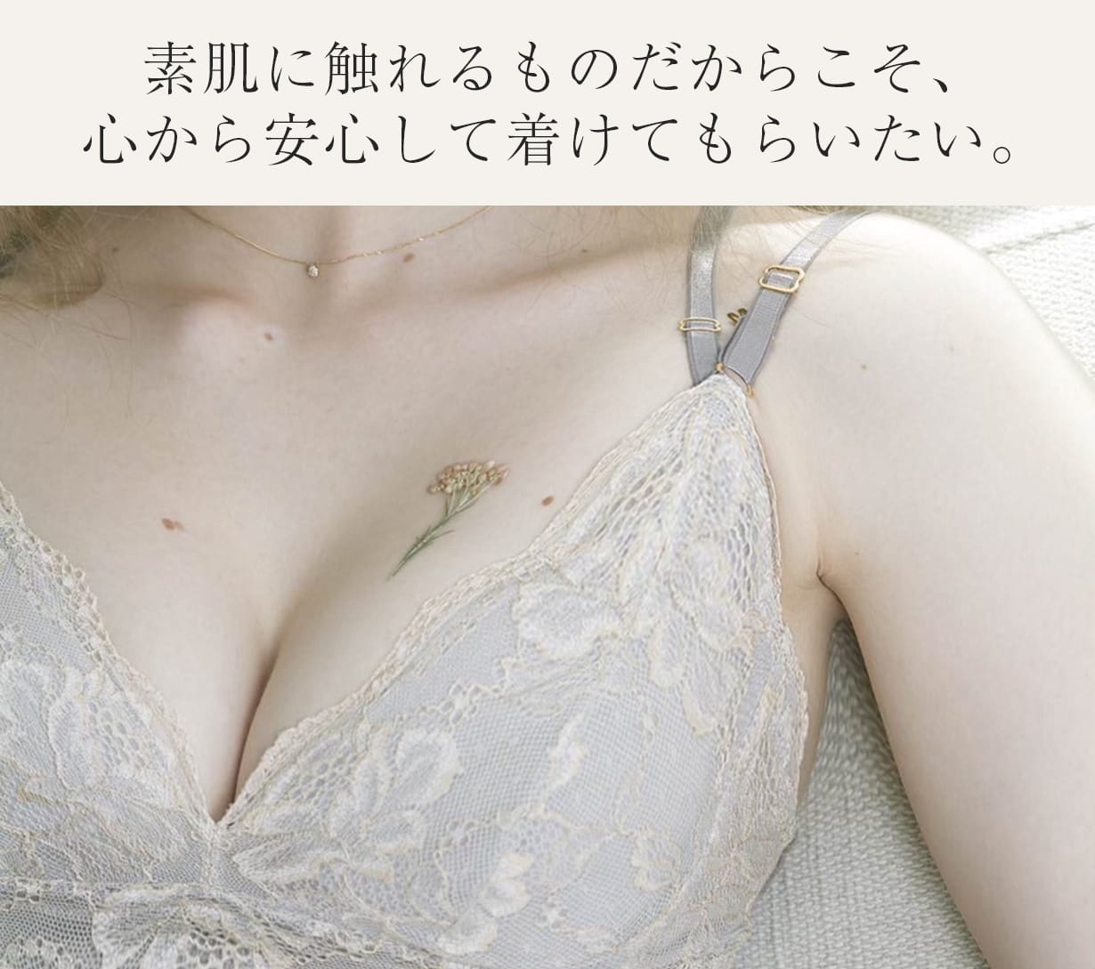 日本製レースの伸縮性をメインに使用しているため、カップが付いていなくても幅広いサイズのバストに適応できるフィット&ホールド感を実現