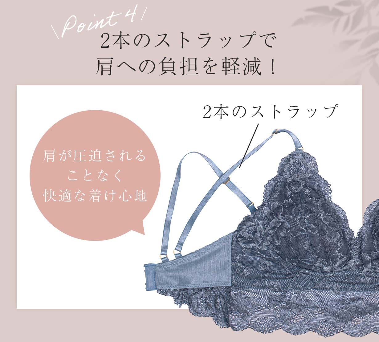 ストラップを2本に分けることで肩への負担を分散し、従来のブラジャーよりリラックスして着用できます。