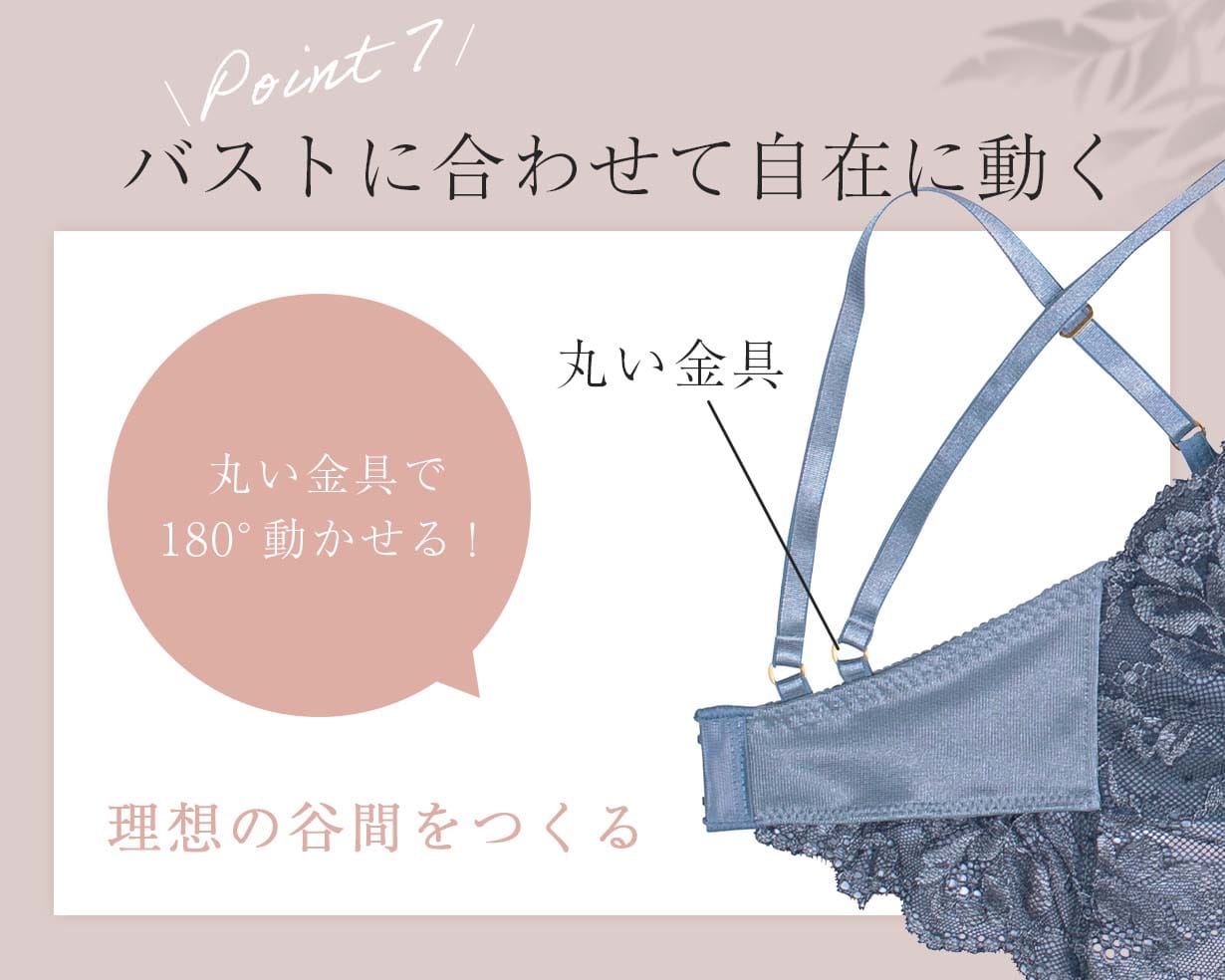 “バストを包み込む一本”と、“バストを引き上げ中心へと集め谷間を形成する一本”の二本で幅広いサイズ調整が可能に。